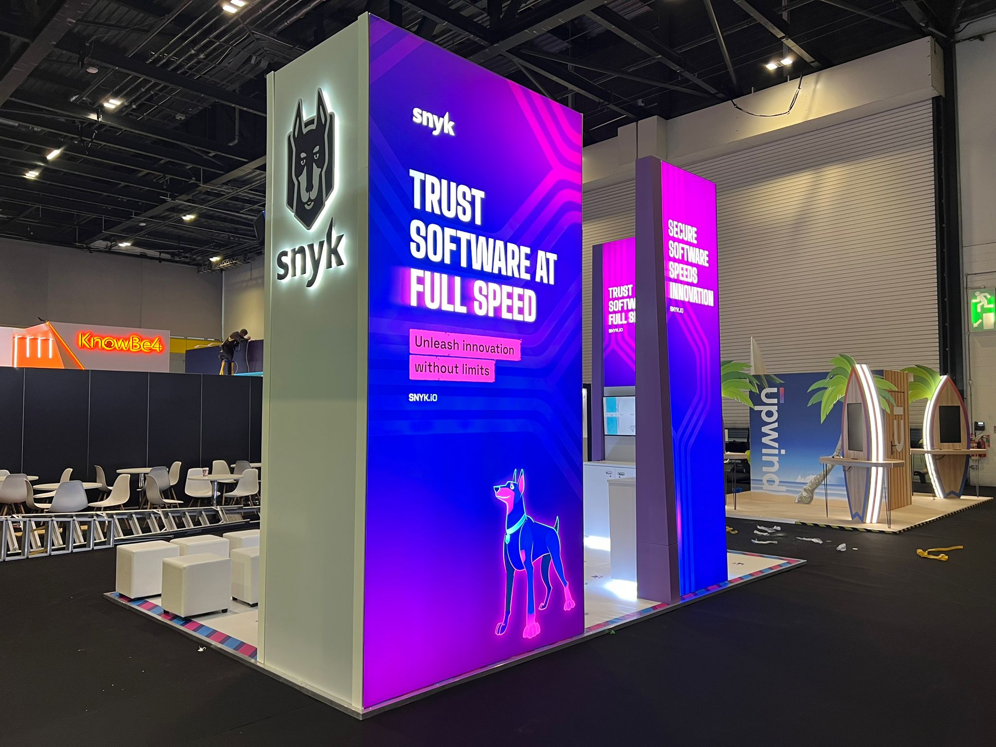 Various design including promotional web assets, blogs, booths, social and web ads that incorporate Snyk's brand expression that feels both authentic and elevated and recognizable. Honoring Snyk's iconic purple and introducing new graphic elements that enhances the AI-powered platform.